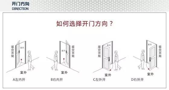 首先,我們要知道,開(kāi)門的方向可以分為:內(nèi)左、內(nèi)右、外左、外右四個(gè)方向,這四個(gè)方向各部相同。其實(shí)在選擇開(kāi)門方向的時(shí)候,首先是根據(jù)個(gè)人的習(xí)慣和家人的習(xí)慣來(lái)選擇門開(kāi)啟的方向的,使用順手才是最關(guān)鍵的。